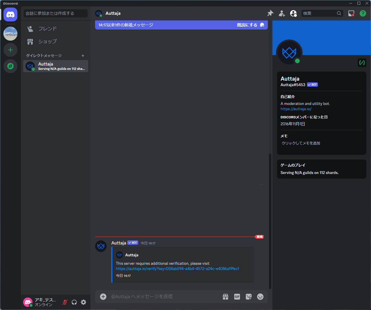 2. AuttajaというBOTからのDMを確認し、URLをクリックします。