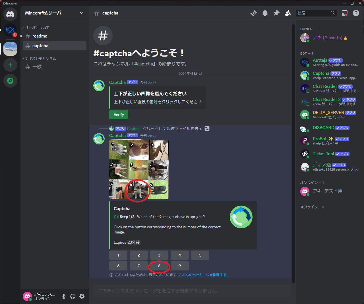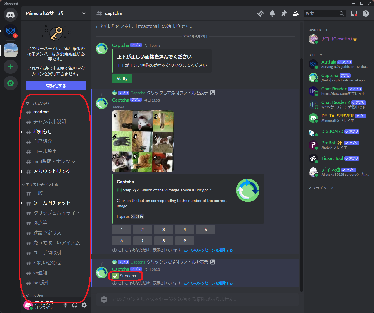 1. サーバにJoinしたら、readme・一般・captchaチャンネルのみが見えており、発言できない状態です。