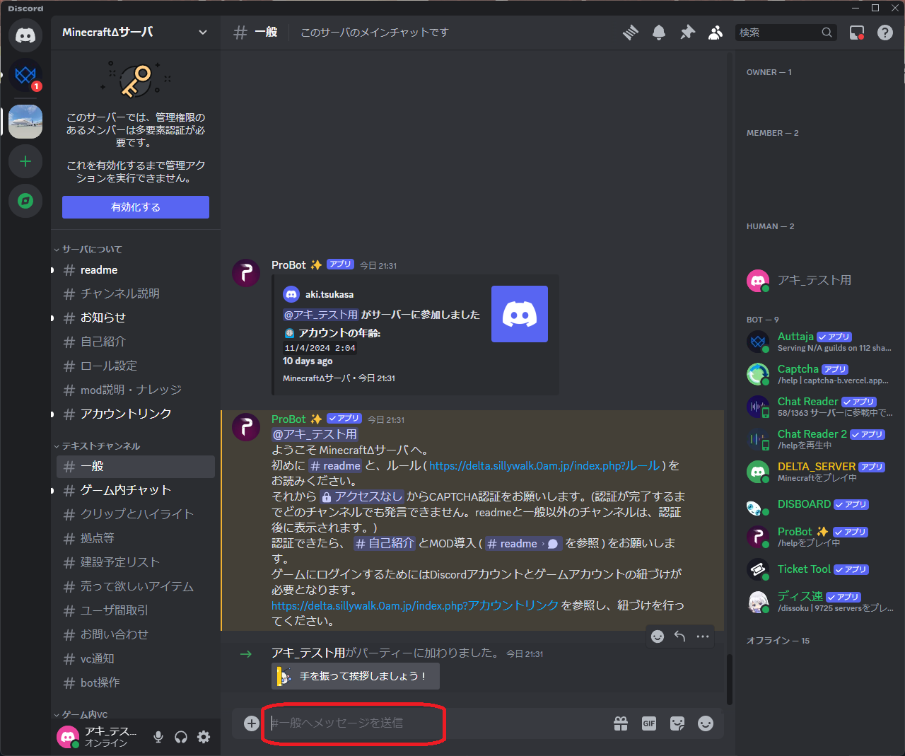 - サーバにJoinしたら、readme・一般・captchaチャンネルのみが見えており、発言できない状態です。