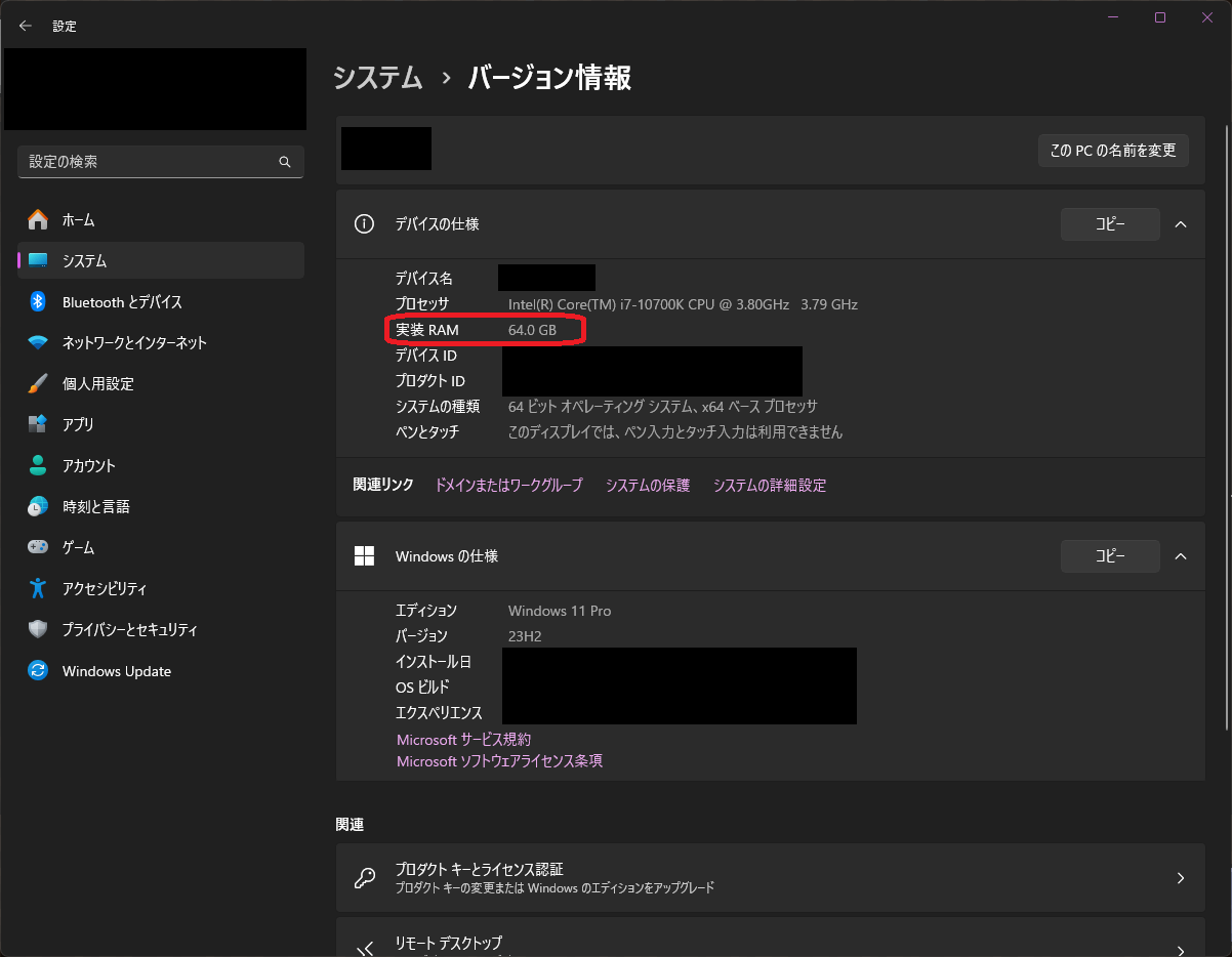 実装RAMと書かれた項目がPCのメモリ容量です。